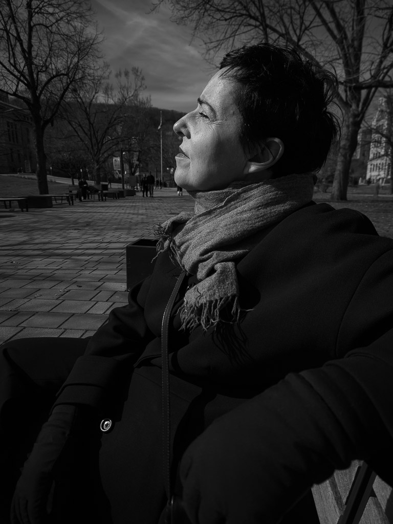 Woman Profile - taking the spring sun, sitting on a bench