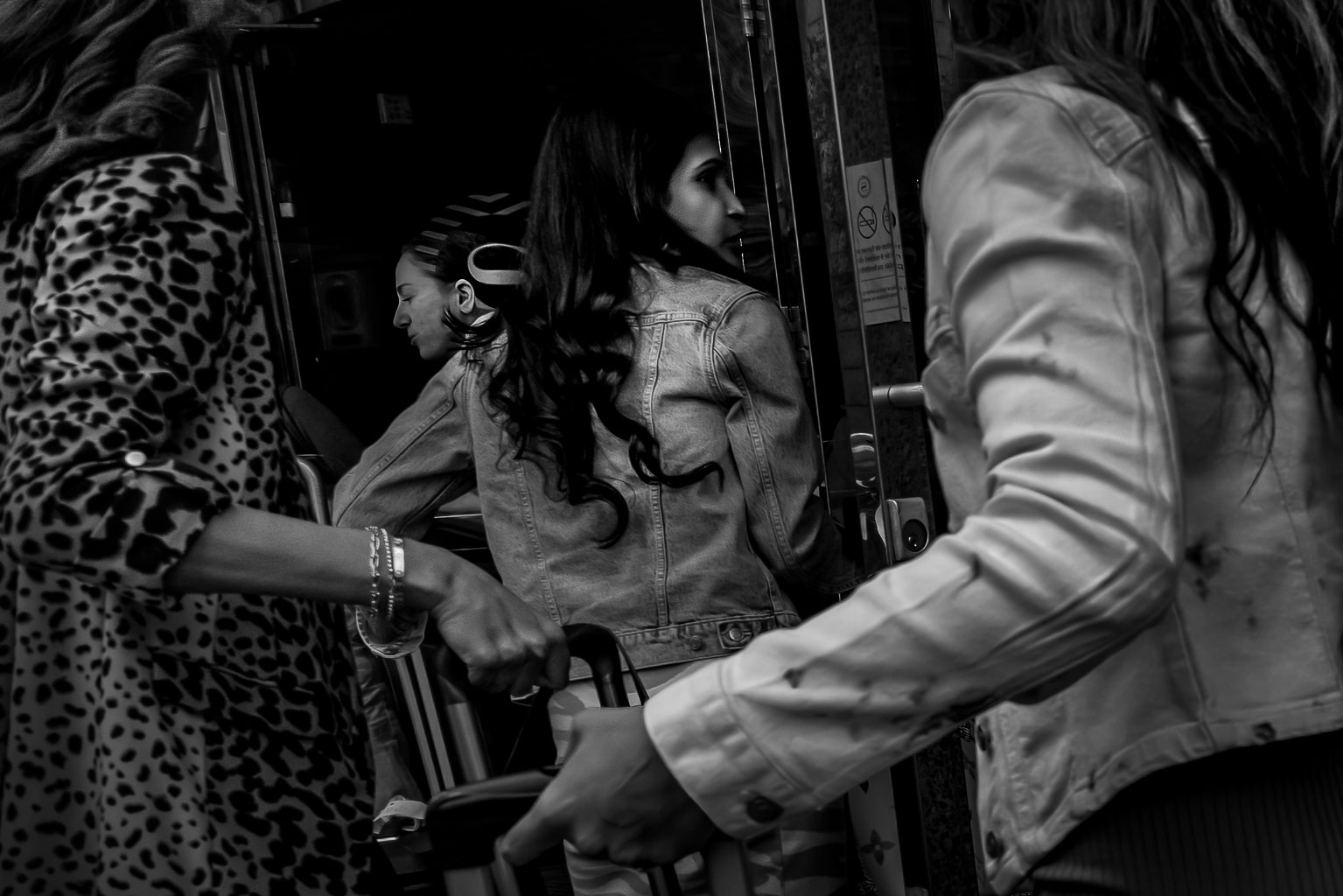 Three women in the rush to pass the hotel door