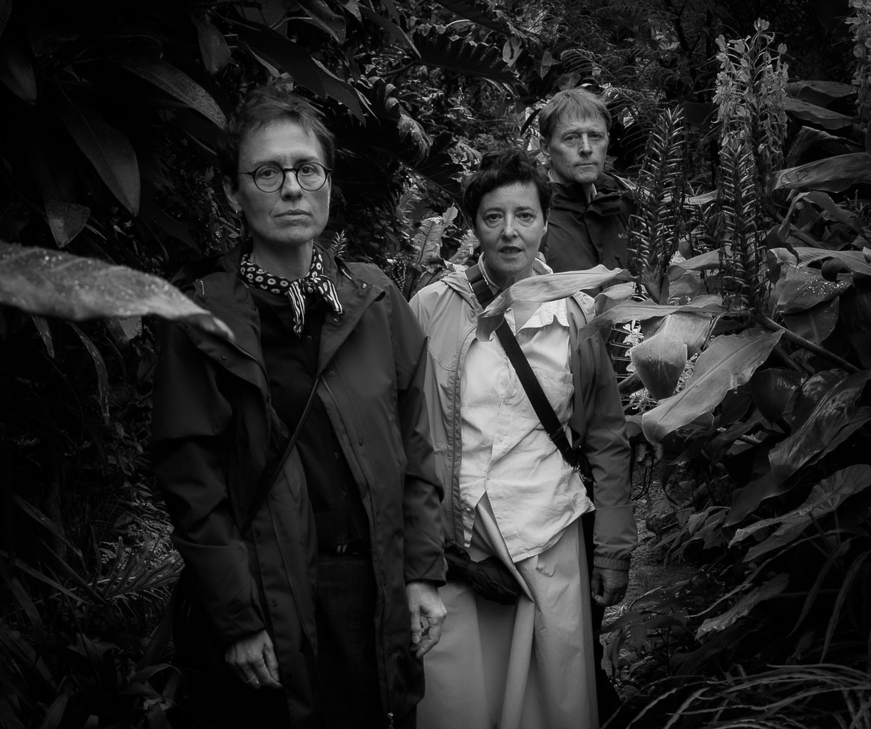 People standing in a luxurious greenhouse foliage